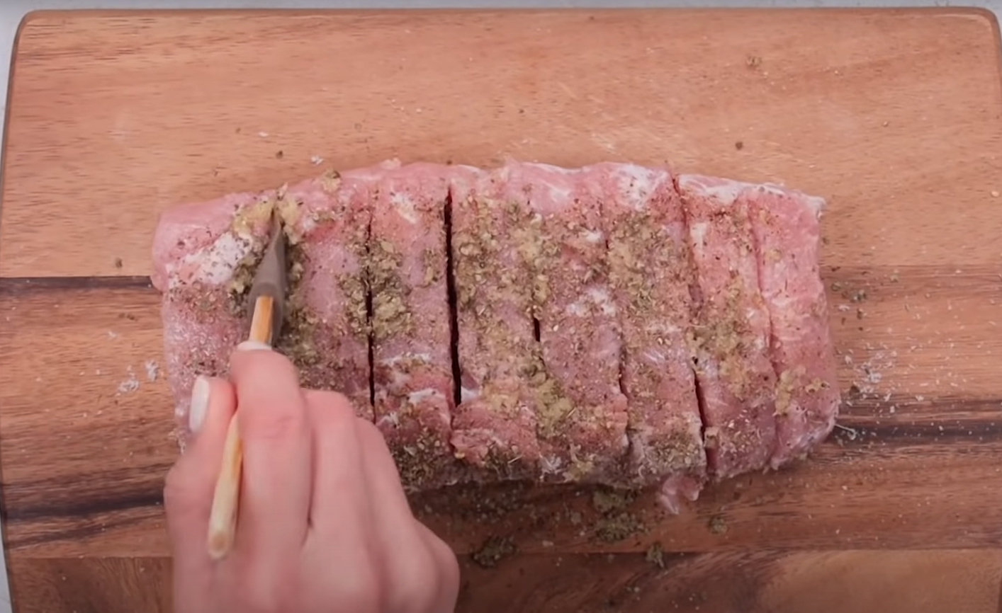 Jak pokazano na obrazku, naciąć nożem schab wieprzowy. Nie przecinaj mięsa na wylot. Doprawić mięso solą i pieprzem oraz majerankiem. Następnie przeciskamy czosnek przez tłuczek i rozbijamy go.