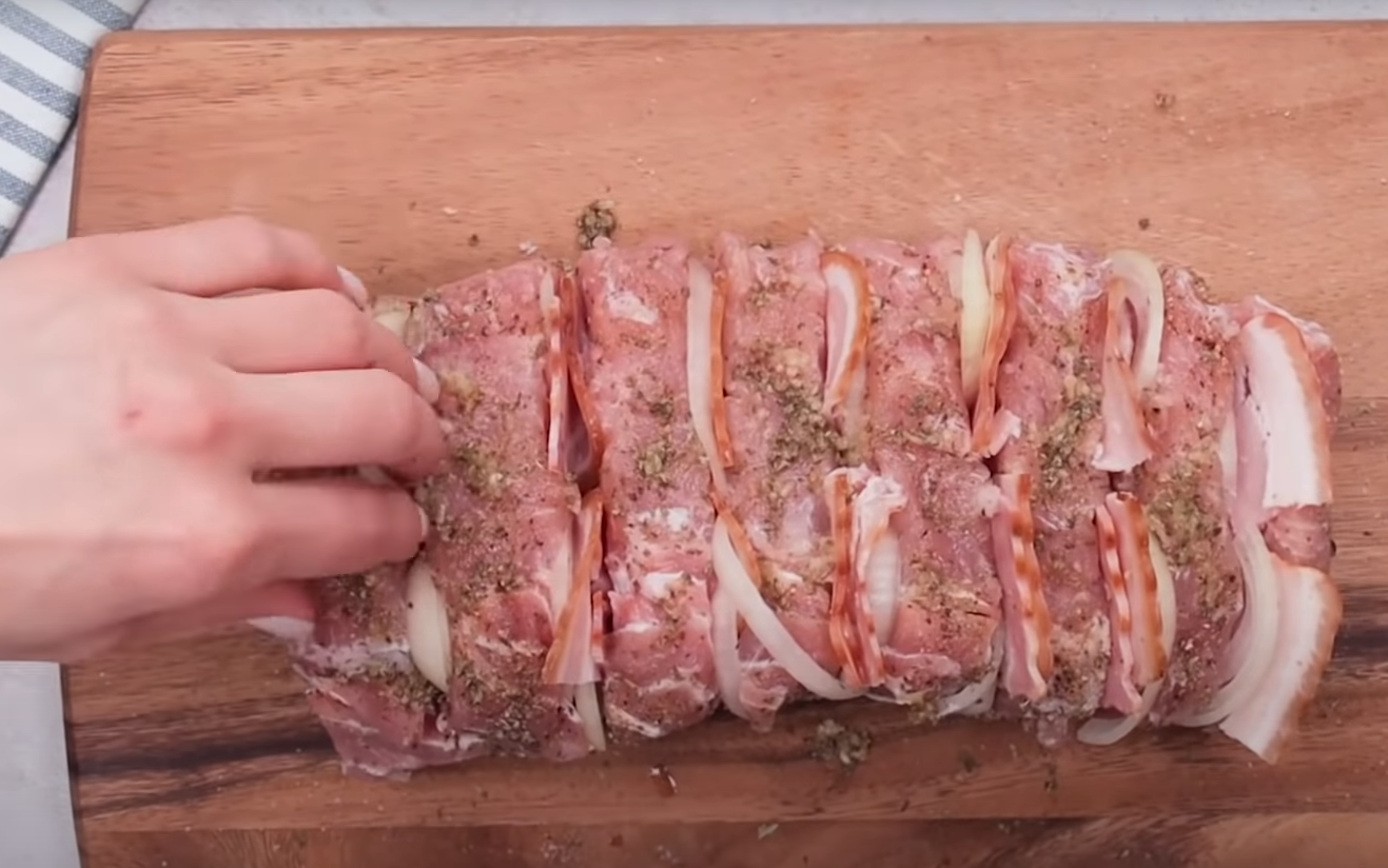 Obraną cebulę kroimy na połówki. Boczek kroimy w cienkie plasterki. W każde miejsce włożyć po odrobinie cebuli i boczku.