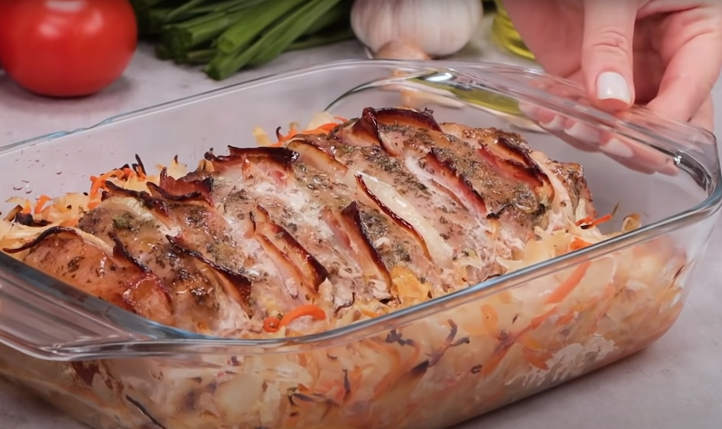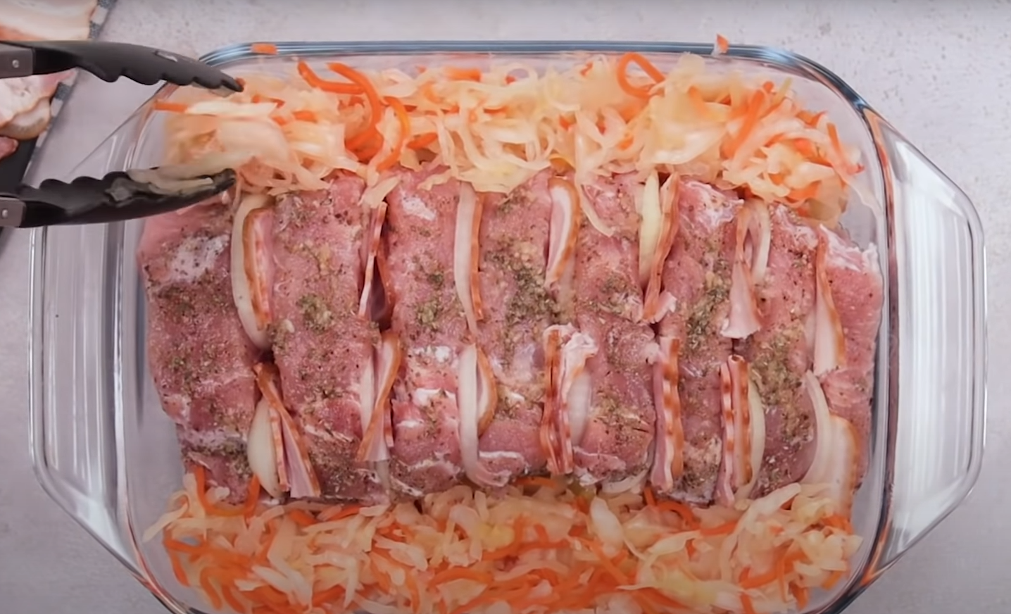 Ogórki kiszone pokroić w kostkę i włożyć w szczeliny. Kiszoną kapustę można owinąć wokół mięsa.