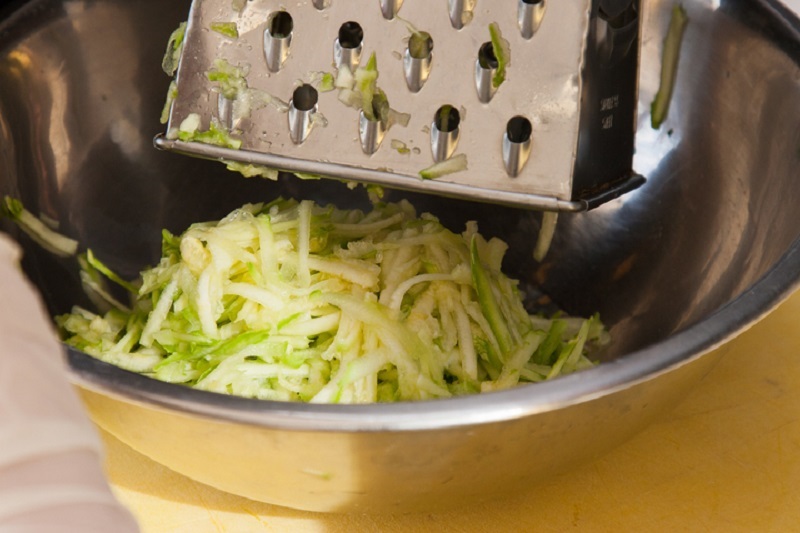 Umyj cukinię i zetrzyj ją na tarce. Nie musisz jej wcześniej obierać.