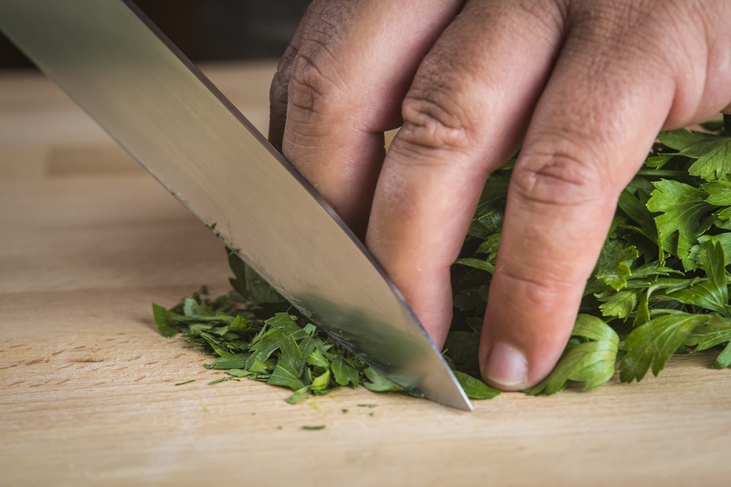 Posiekaj zioła np. natkę pietruszki lub koperek. Możesz pokroić obydwa rodzaje ziół.