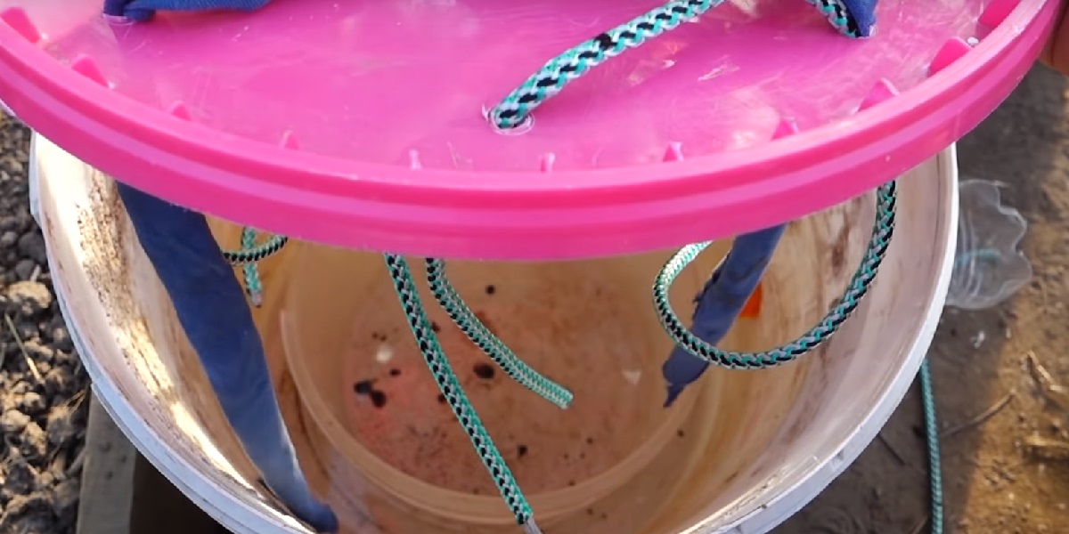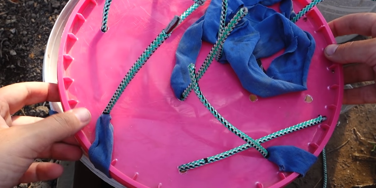 Przyda Ci się również ścierka i sznurek. Potnij szmatkę na paski a sznurek na kawałki. Jego długość powinna być o 3 cm większa niż wysokość dużego wiadra. Paski i sznurki zamontuj w dziurach pokrywy.