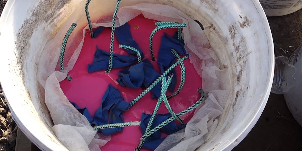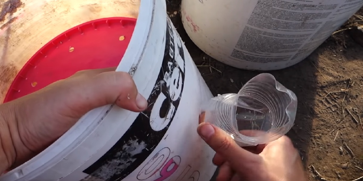 Do wiadra nalej wodę. Ziemię z ogrodu zmieszaj ze 100 g popiołu i 0,5 litra obornika, całość dokładnie wymieszaj. Alternatywą jest kupienie gotowej ziemi w sklepie ogrodniczym. Podczas zasypywania trzymaj pionowo sznurki.