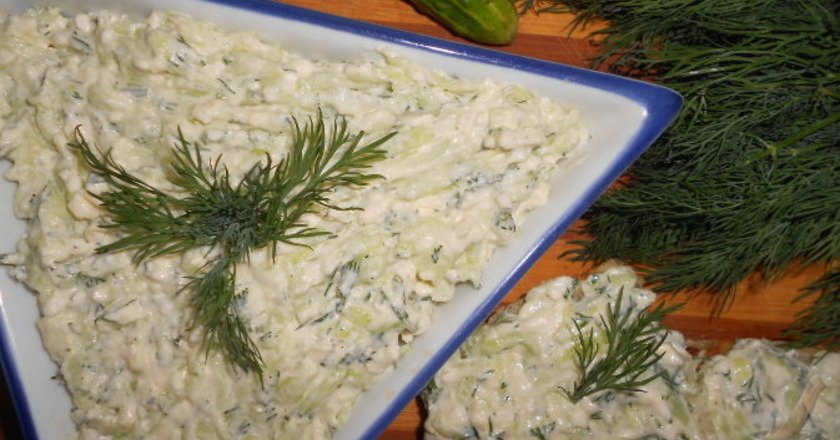 Zioła po umyciu i osuszeniu należy drobno posiekać. Ogórka obrać, a następnie zetrzeć go na tarce na małych oczkach i ręcznie wycisnąć zalegający w nim sok. Wszystkie składniki dokładnie wymieszać ze sobą. Smacznego!