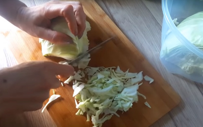 W tym czasie poszatkuj kapustę i posiekaj drobno cebulę. Na patelni z rozgrzanym olejem podsmaż cebulkę na złoty kolor, po czym dodaj do niej poszatkowaną kapustę. Smaż na mocnym ogniu, ciągle mieszając.