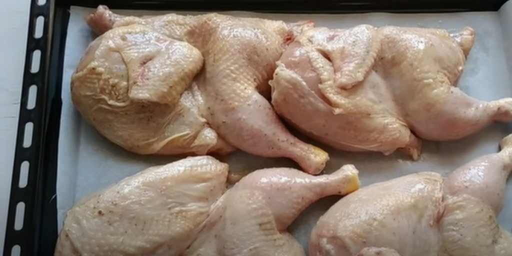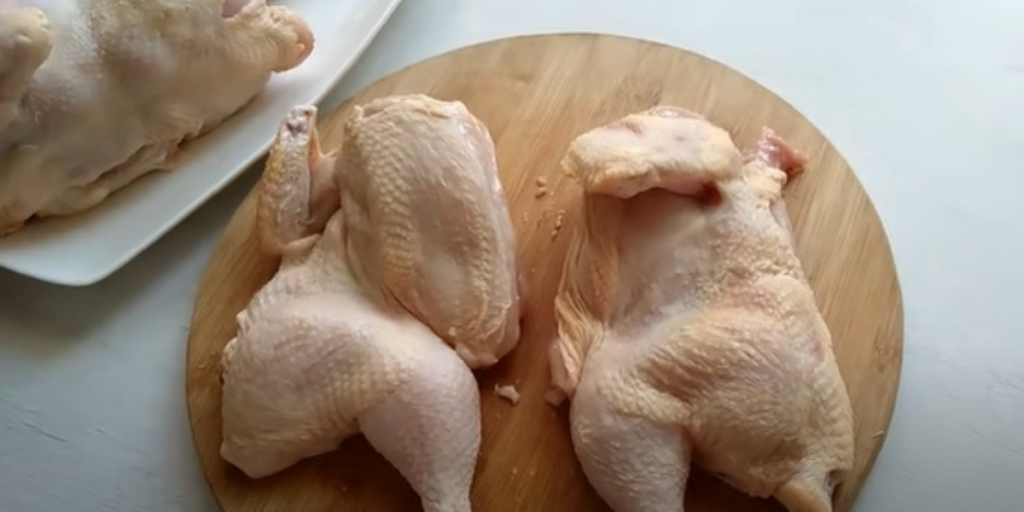 Z osuszonego kurczaka należy usunąć szyję i końcówki skrzydeł. Można go przekroić na pół wzdłuż na dwa kawałki.