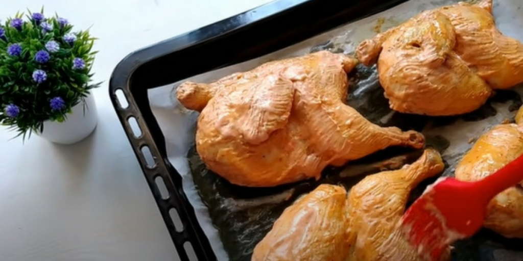 Ostrym nożem naciąć każdy kawałek kurczaka w kilku miejscach. Rozgrzej piekarnik do 250°C. Umieść kurczaka na blasze do pieczenia. Piec kurczaka przez 20 minut lub do momentu, aż będzie lekko zarumieniony. Wymieszać majonez i pastę pomidorową. Gdy czas minie, wyjmij blachę z piekarnika i natrzyj nim mięso.