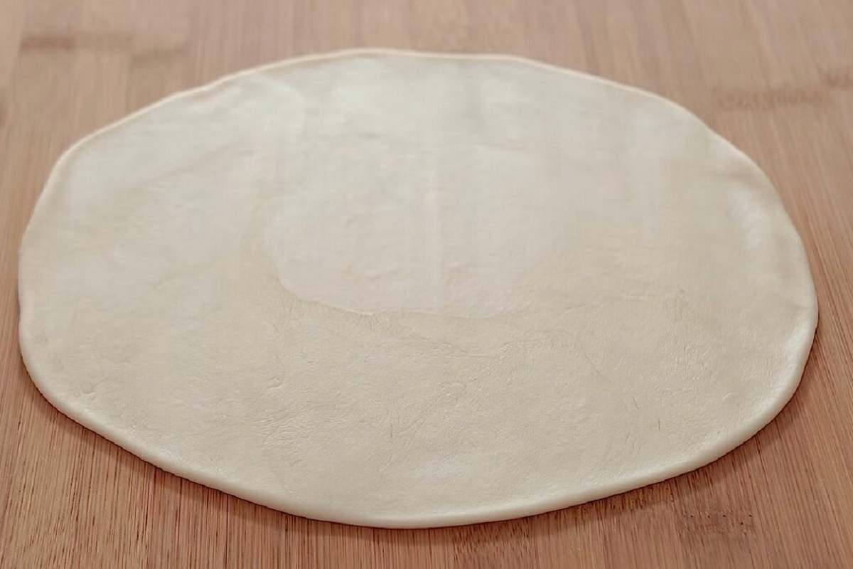 Rozsmarować na nim masę serową. Złożyć brzegi ciasta na środku i połączyć je.