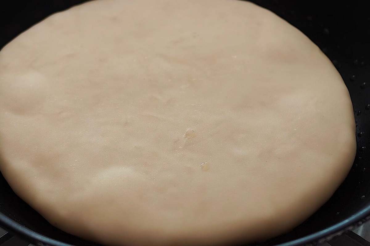 Włóż placek do oleju i usmaż na dużej patelni. Odwróć go i smaż do uzyskania złotobrązowego koloru.