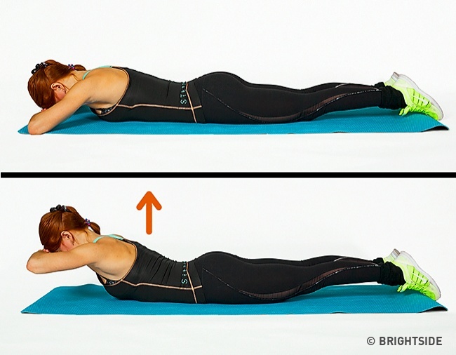 Kładziemy się na brzuchu ze zgiętymi rękoma pod twarzą. Podnosimy górną część ciała tak wysoko jak jest to możliwe czekamy chwile po czym opuszczamy tułów. To ćwiczenie bardzo dobrze wzmacnia nasz kręgosłup.