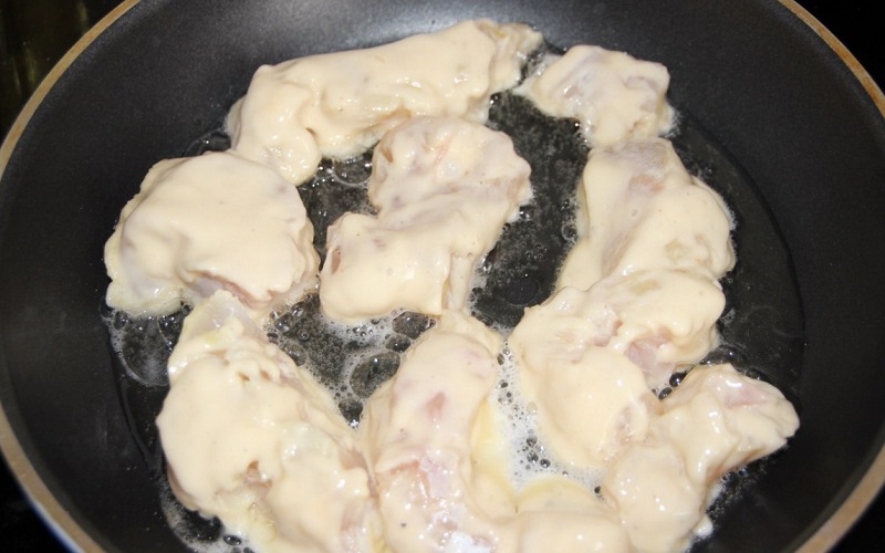 Żółtka wymieszaj z cukrem i solą, dolej następnie wody mineralnej i porcję mleka. Białka starannie ubij i dodaj do wcześniej przygotowanej masy. Przypraw i zamieszaj. Ciasto do panierowania gotowe.