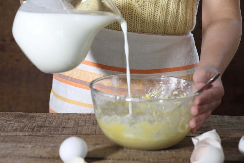 Do powstałej masy dodaj mleko i olej (np. słonecznikowy)