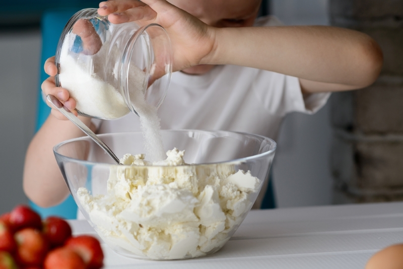 Zacznij od nadzienia: utrzyj jedno jajko z cukrem (lub innym słodzidłem) i twarożkiem