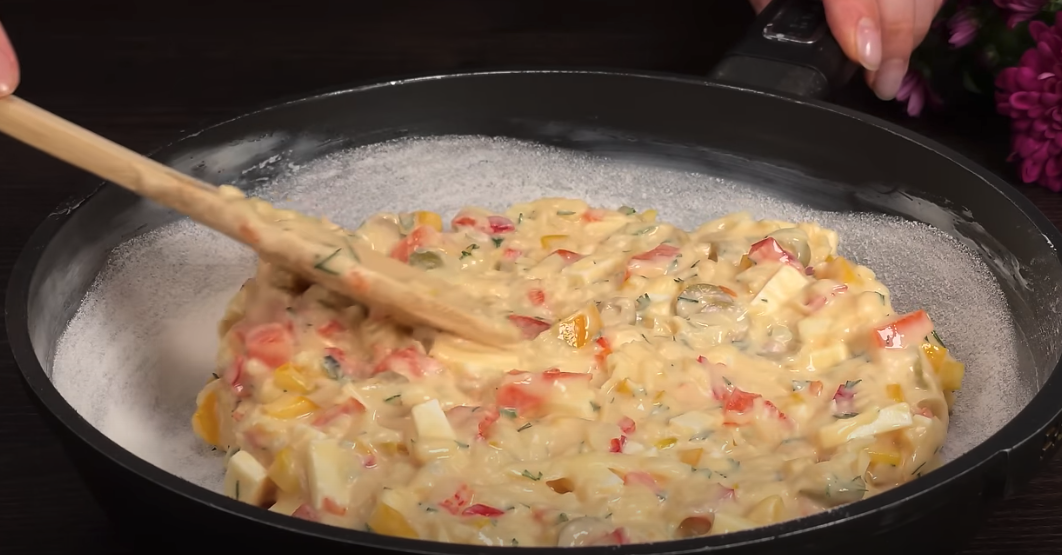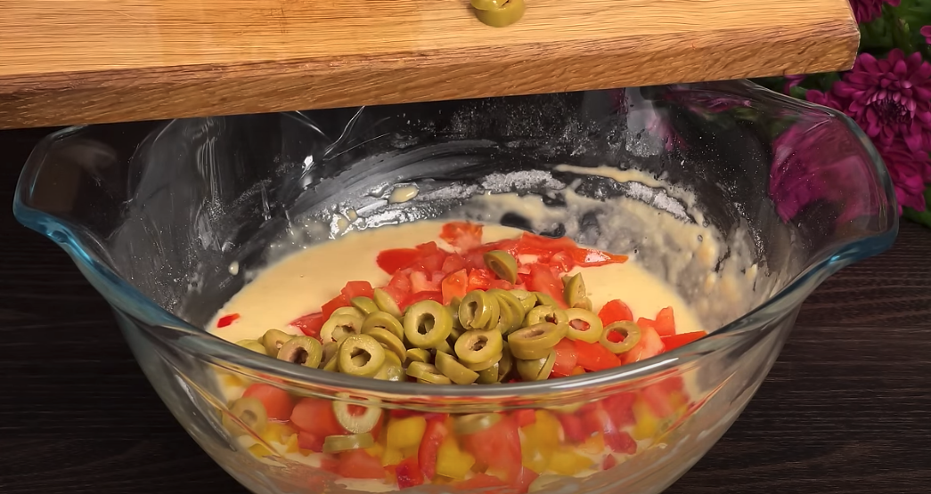 Pokrój żółtą i czerwoną paprykę w drobną kostkę. Pokrój pomidora w kostkę. Posiekaj koperek. Pokrój zielone oliwki na plasterki. Pokrusz fetę na małe kawałki.W dużej misce ubij jaja. Dodaj olej roślinny i mleko, dokładnie wymieszaj. Dodaj sól, proszek do pieczenia i mąkę, mieszając, aż powstanie gładkie ciasto.