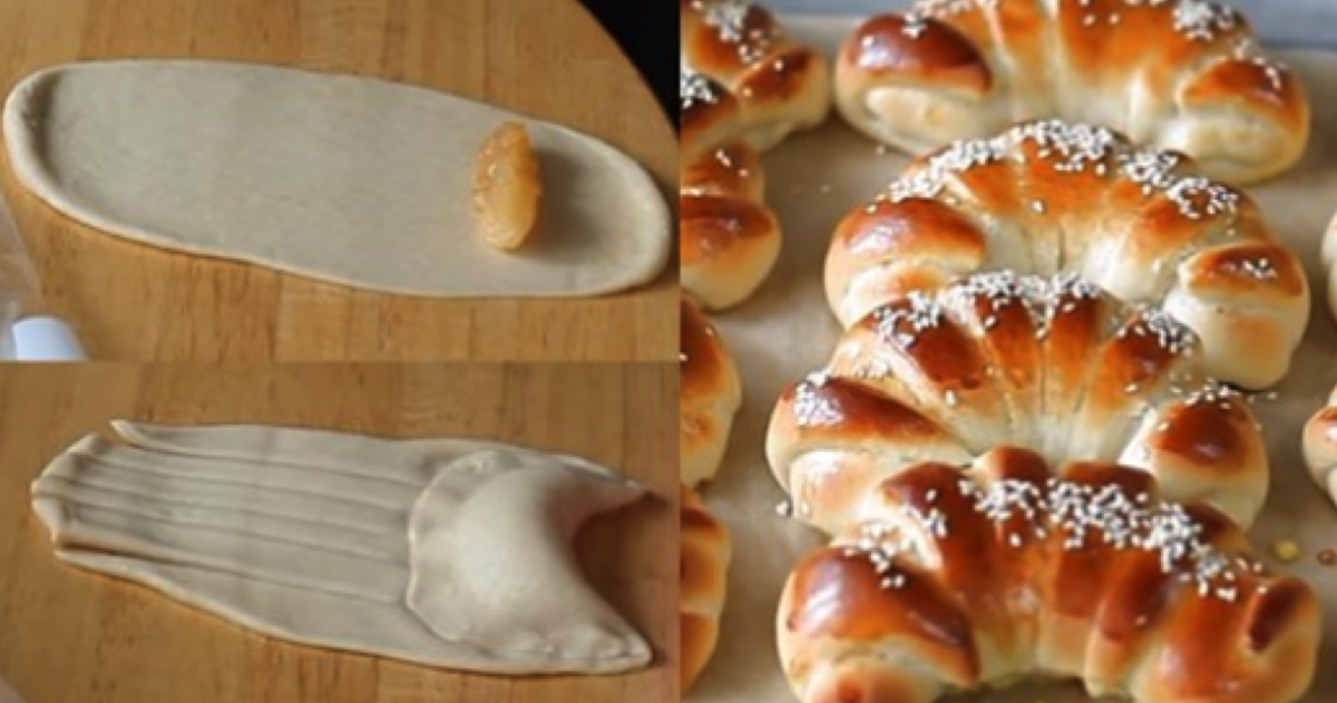 Każdą kulkę rozwałkowujemy na podłużne ciasto o wielkości nieco dłuższej niż dłoń. Następnie kładziemy łyżkę nadzienia na jednej krawędzi i łączymy krawędzie w taki sposób, aby nasze nadzienie nie wyciekło ze środka.