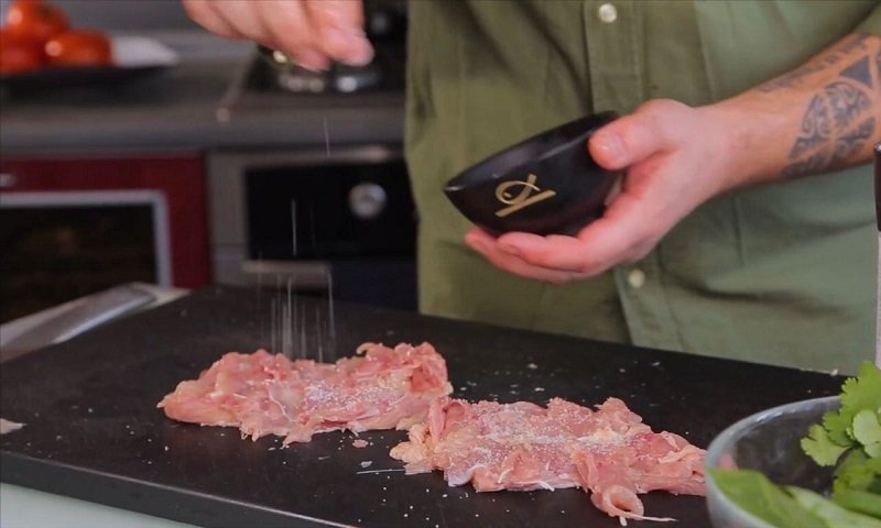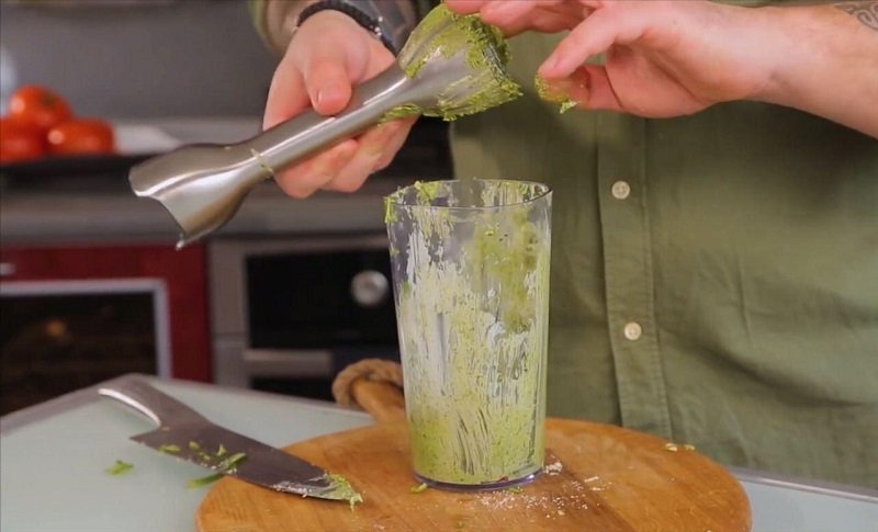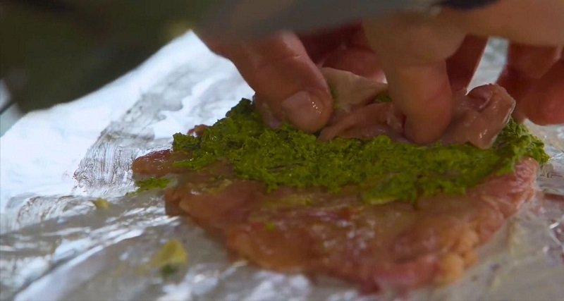 Mięso można przykryć folią spożywczą, a następnie rozbić tłuczkiem lub młotkiem. Zdejmij folię i natrzyj każdy kawałek musztardą. W blenderze zmiksuj kilka ząbków czosnku, cebulę i posiekaną bazylię.
