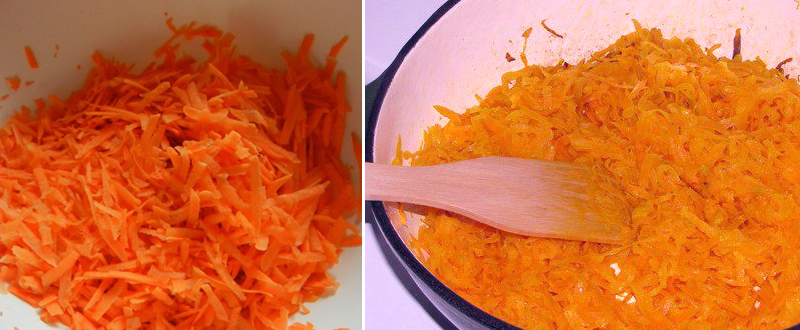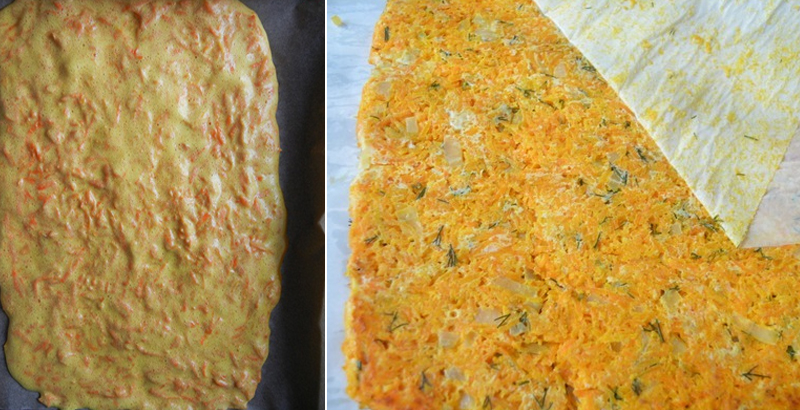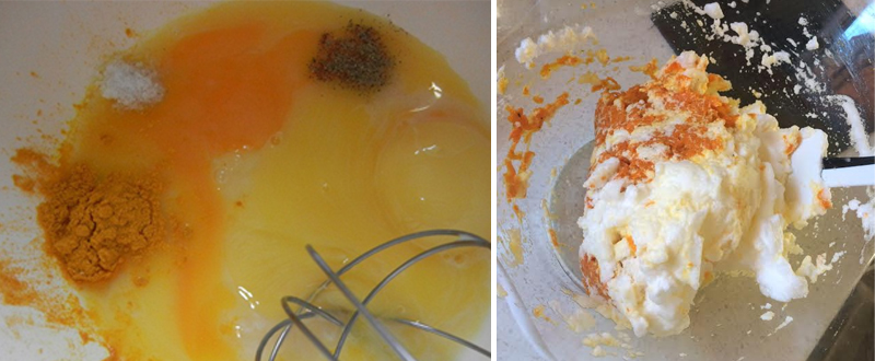 Żółtka oddzielić od białek. Żółtka ubić z solą, kurkumą i pozostałymi przyprawami. Dodać schłodzone już marchewki. W osobnym pojemniku ubić ubić białka z sokiem z cytryny oraz szczyptą soli, aż do uzyskania sztywnej piany. Białka dodać do ciasta. Delikatnie przemieszać wszystko drewnianą łyżką.