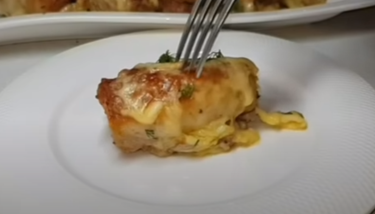 Polej lekko oliwą potrawę po wierzchu i umieść w piekarniku nagrzanym do 180 stopni oraz piecz przez około 40 minut. Pod koniec upłynięcia tego czasu wyjmij naczynie z piekarnika i posyp każdą z roladek wcześniej startym serem. Całość możesz posypać siekanym serem i gotowe! Smacznego !