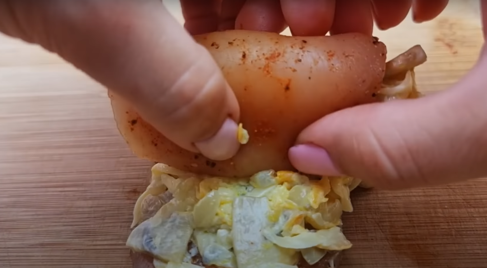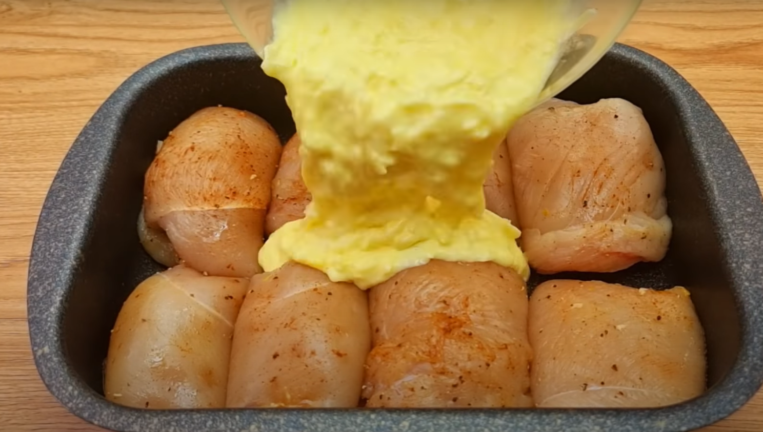 Ułożyć roladki na wysmarowanej tłuszczem blasze do pieczenia. Jajka i pozostały ser wymieszać z jogurtem. Doprawić sos solą i pieprzem, a następnie ułożyć kurczaka na blasze do pieczenia. Piec mięso przez około 30 minut w temperaturze 200°C.