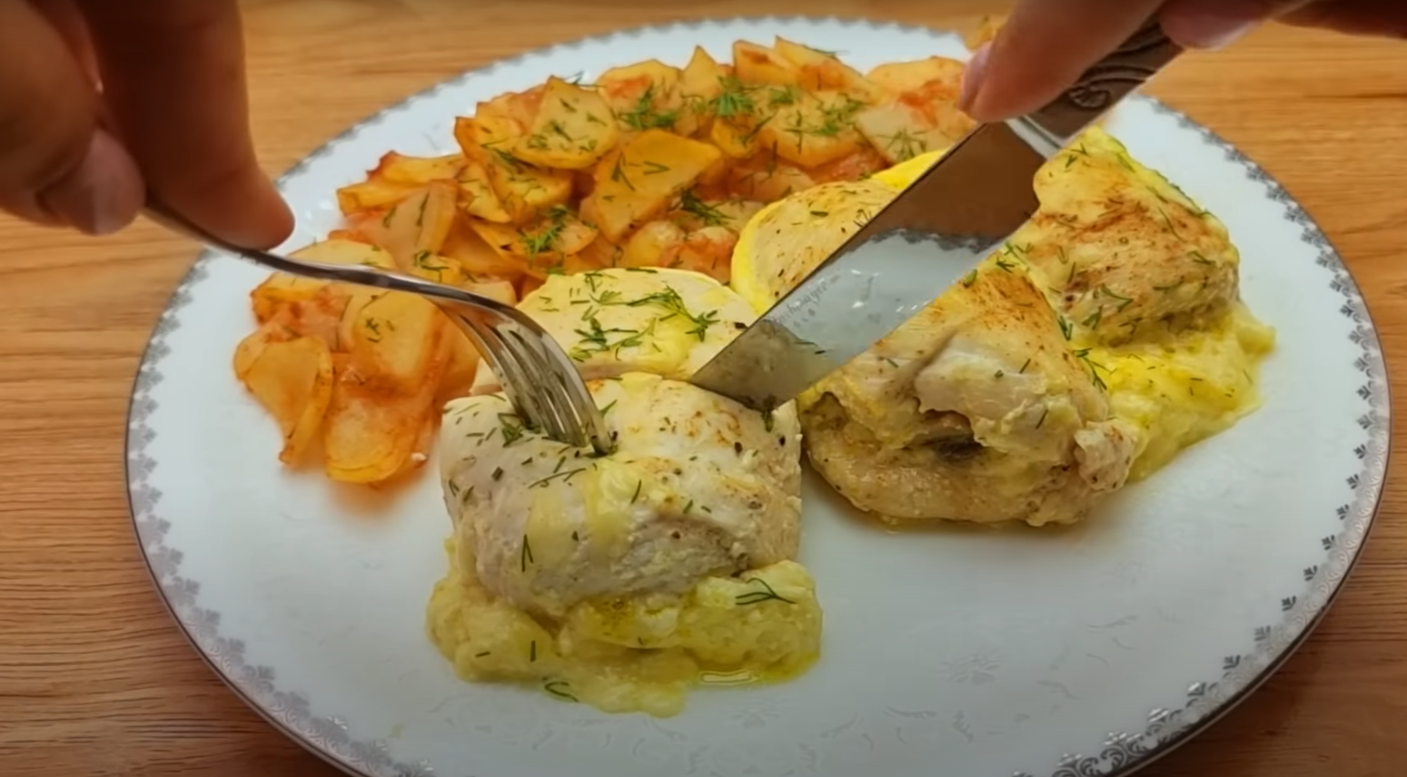 Rozłożyć ziemniaki na wysmarowanej tłuszczem blasze i piec w temperaturze 200° przez 35 minut. Podczas gdy ziemniaki się pieką, zetrzyj ser na tarce. Podzielić na dwie porcje. Jeden z utartych serów można dodać do duszonych warzyw. Do drugiego ząbka czosnku dodać sól i śmietanę. Zwinąć farsz i położyć na wierzchu puree z filetów.