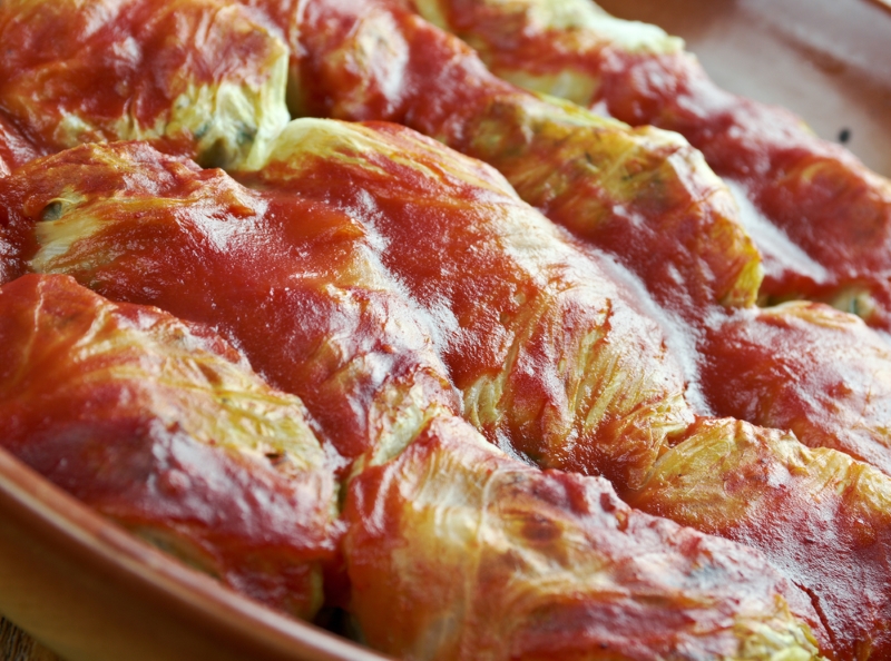 Możesz również użyć naczynia żaroodpornego. Całość przykryj folią i piecz w piekarniku nagrzanym do 200 stopni przez 25 minut. W czasie pieczenia przygotuj sos do gołąbków. Zetrzyj ser, pokrój drobno pomidory, posiekaj pietruszkę, czosnek przeciśnij przez praskę i dokładnie wymieszaj całość. Dodaj śmietanę, sól, pieprz i znów wszystko razem połącz.