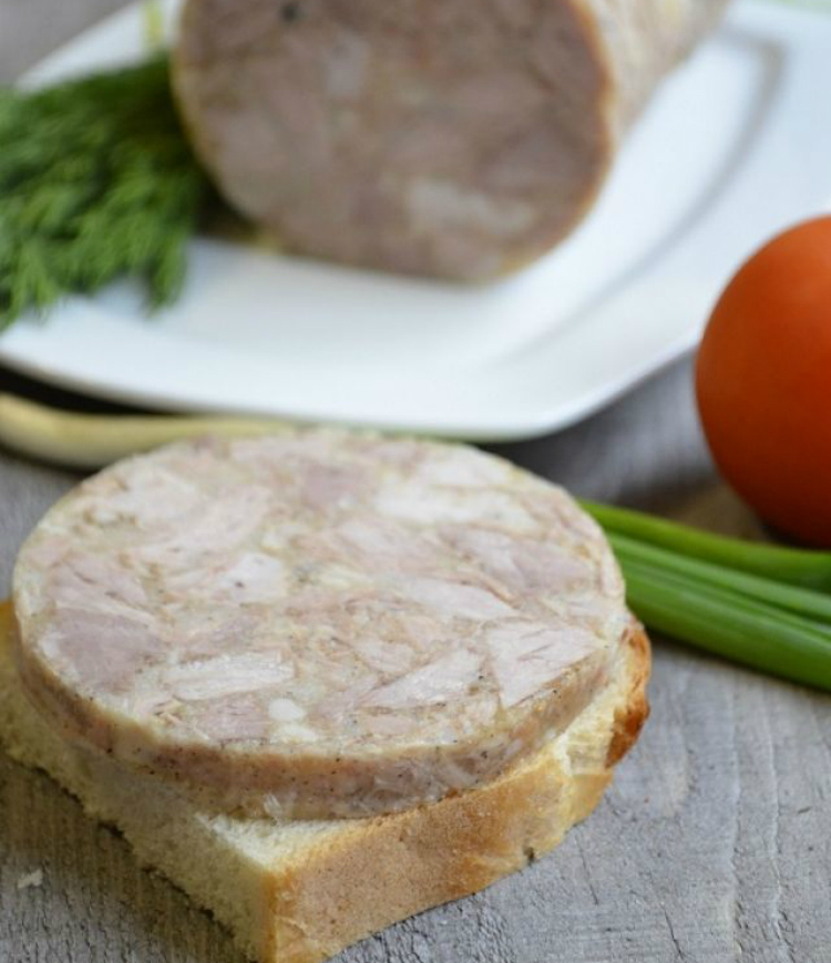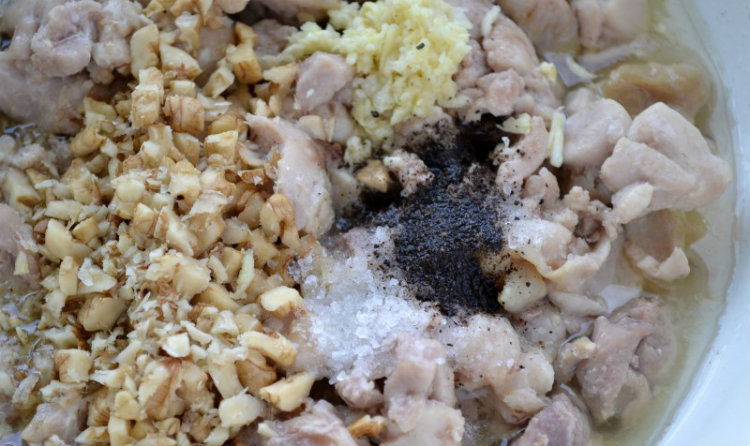Mieszamy gotowa żelatynę z bulionem. Orzechy prażymy na suchej patelni. Czosnek przeciskamy przez praskę, wrzucamy go do mięsa. to samo robimy z orzechami, solą i przyprawami. Zalewamy całość żelatyną.