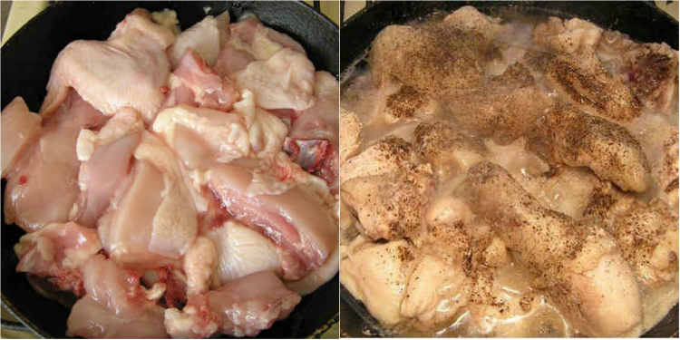 Mięso z kurczaka kroimy na mniejsze kawałki. Wrzucamy je na patelnię żeliwną lub taka, która ma grube dno.