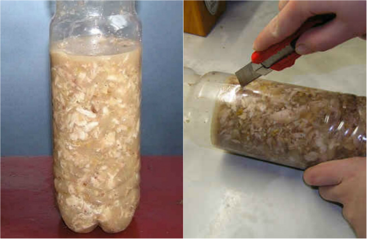 Z czystej plastikowej butelki odcinamy szyjkę. Do butelki wkładamy wymieszane z przyprawami, schłodzone mięso. Butelkę umieszczamy w lodówce na co najmniej kilka godzin, aż salceson stężeje.