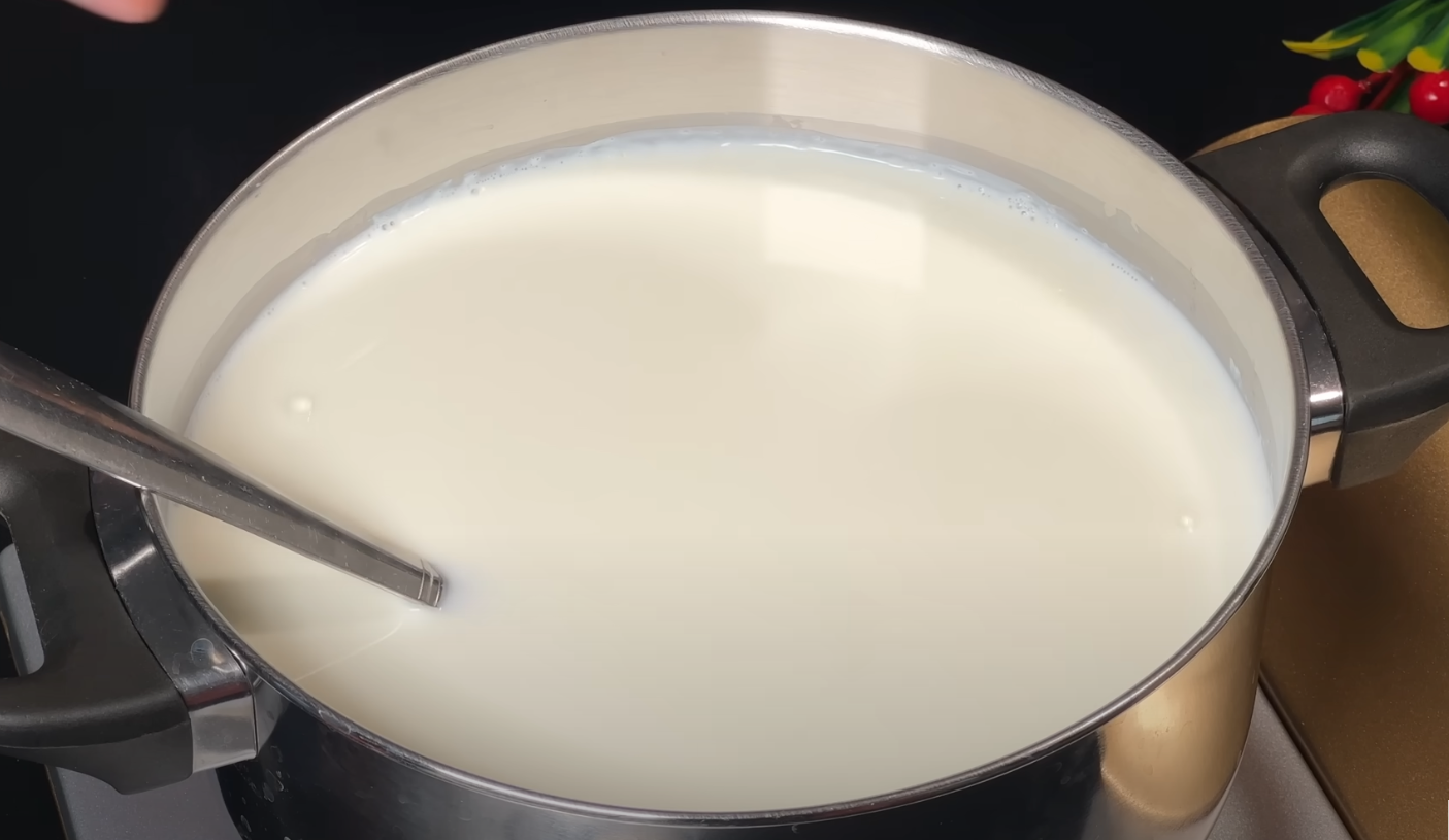 Doprowadź mleko do wrzenia na średnim ogniu, ciągle mieszając, aby uniknąć przypalenia.