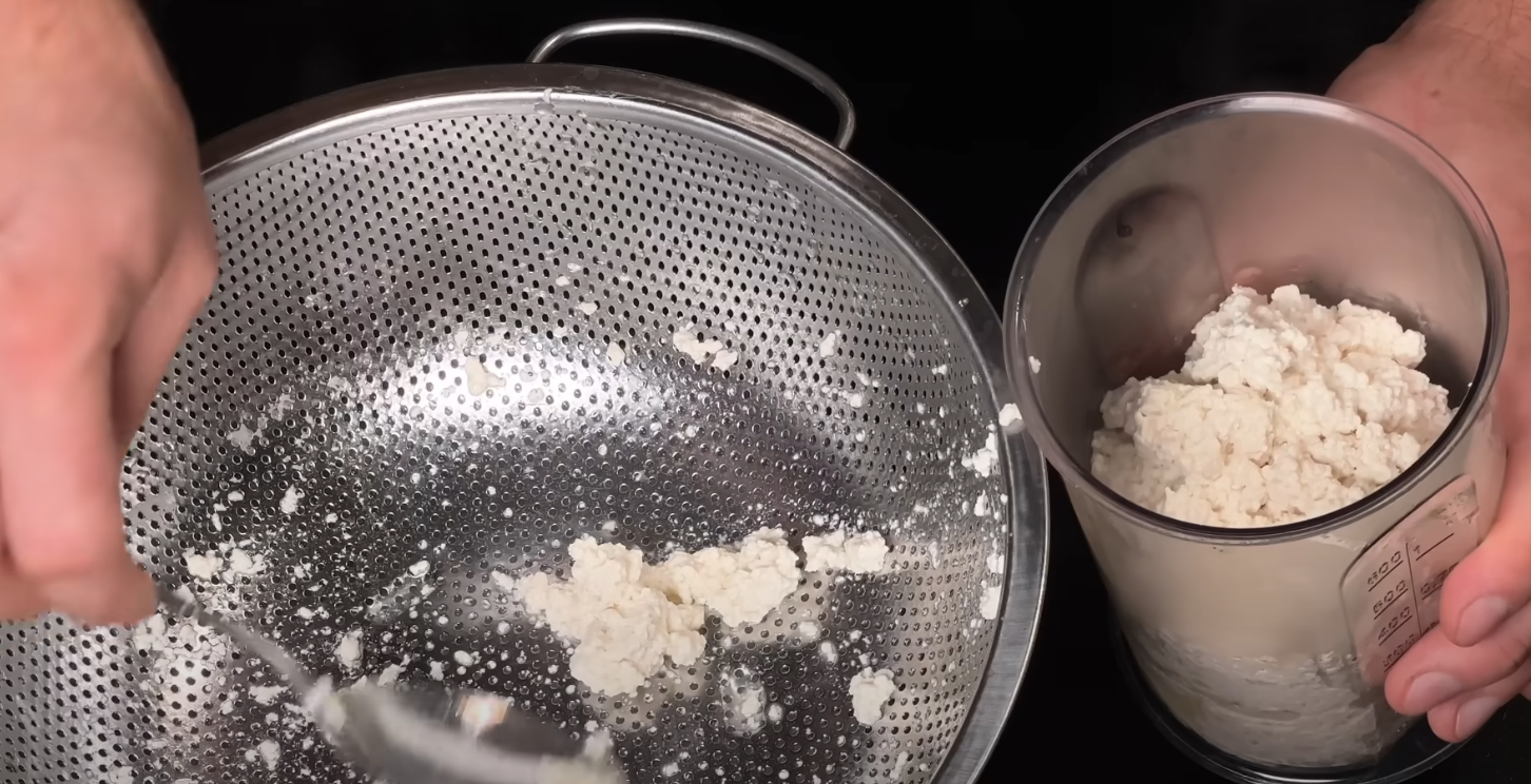Wlej mieszankę mleka i serwatki do durszlaka, aby oddzielić serwatkę od skrzepu sera.