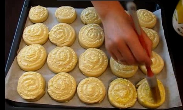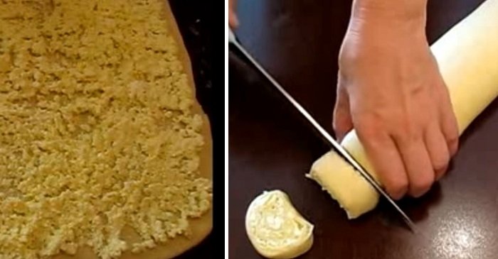 Uważaj jednak, aby nie przesadzić! Tak powstałą substancję przykryj talerzem lub folią spożywczą i zostaw w temperaturze pokojowej. Nie wsadzaj jej do lodówki. Podrośnięte ciasto rozwałkuj tak, aby powstał prostokąt o wysokości 1 cm. Na ciasto przełóż nadzienie twarogowe. W kolejnym kroku zawiń ciasto z nałożonym serem w rulon (podobnie do zawijania makowca!).