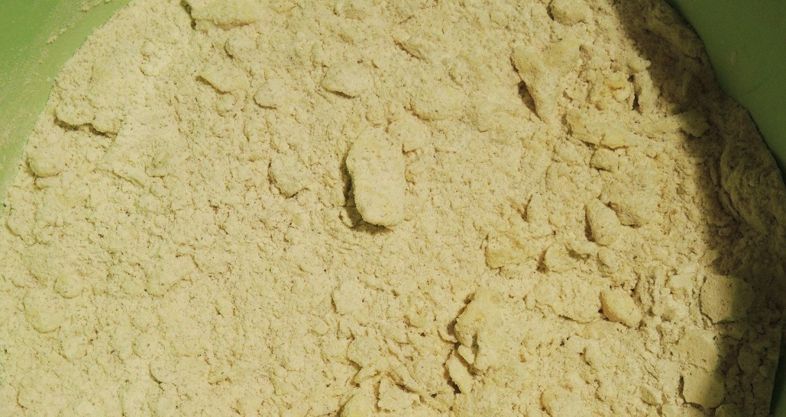 Mąkę z proszkiem do pieczenia przesiać. Dodać pokrojone na małe kawałki masło i starannie wymieszać składniki.