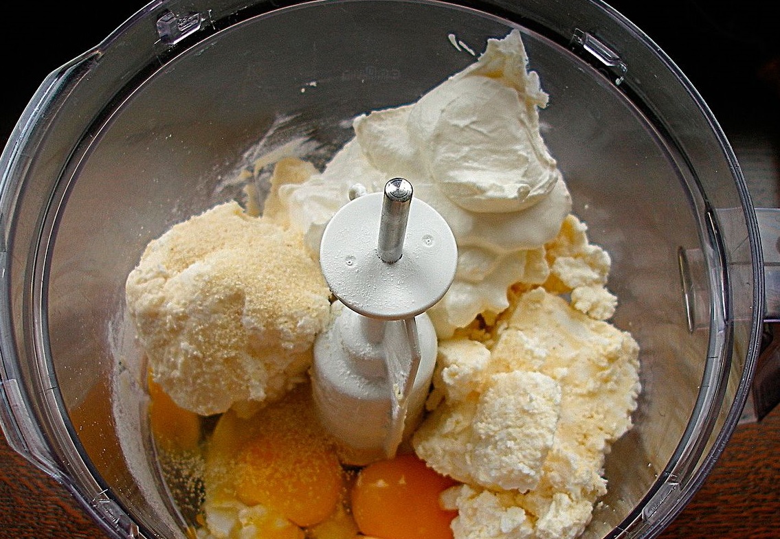 W międzyczasie dokładnie wymieszać twaróg z drugim jajkiem, śmietaną, pozostałym cukrem i cukrem wanilinowym. Foremkę o bokach o wysokości 4-5 cm wysmarować tłuszczem. Wylepić ją równomiernie schłodzonym ciastem.