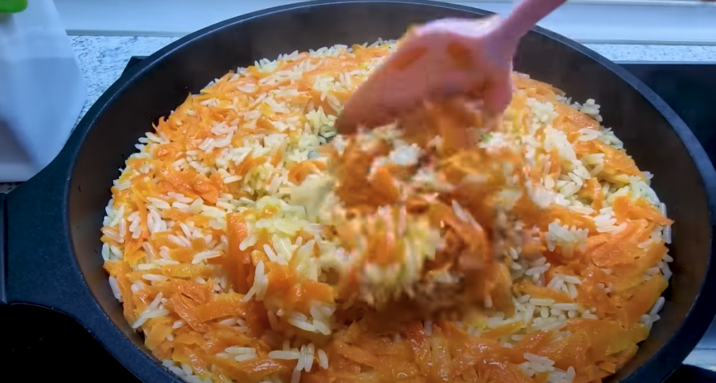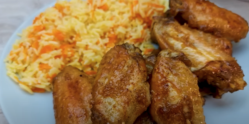 Dodaj 1,3 szklanki wody i sól do smaku. Przykryj pokrywką i gotuj na średnim ogniu, aż cała woda wyparuje. Podawaj skrzydełka z kurczaka z ryżem i smażoną marchewką.