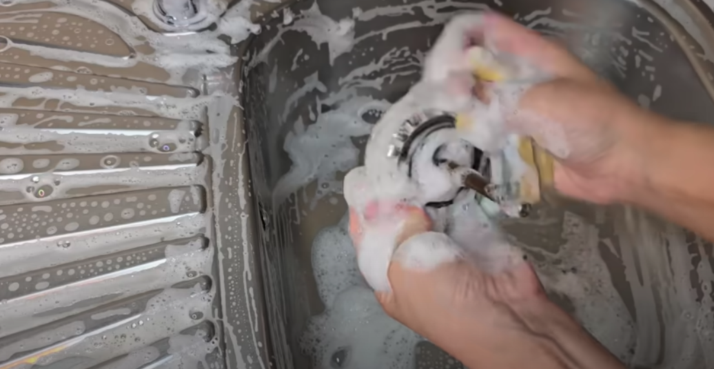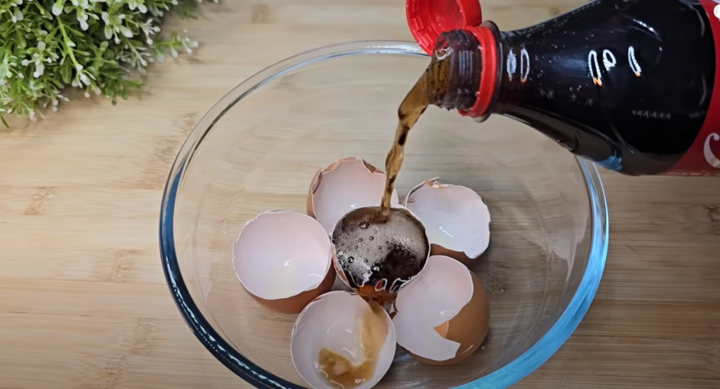 Umyj i osusz skorupki jajek, aby usunąć wszelkie resztki białka i żółtka. Wlej filiżankę Coca-Coli do blendera. Dodaj skorupki jajek. Blenduj, aż skorupki zostaną drobno zmielone. Do zmielonych skorupek i Coca-Coli dodaj filiżankę detergentu do zmywarek oraz filiżankę wody. Dobrze wymieszaj, aż wszystkie składniki się połączą.