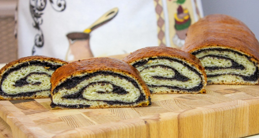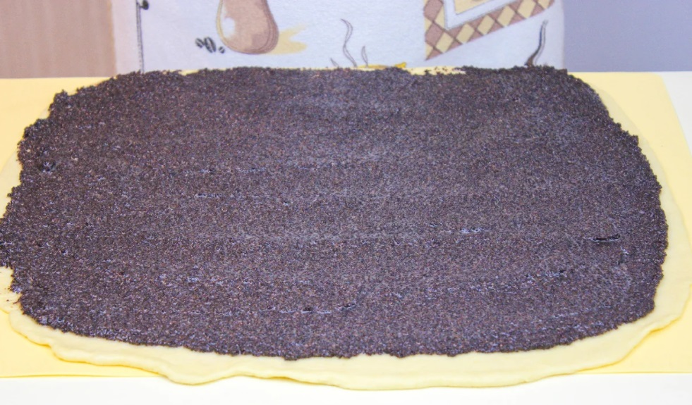 Rozsmarować równomiernie masę makową na cieście. Zwinąć ciasto w rulon i ułożyć na blasze wyłożonej papierem do pieczenia. Posmarować wierzch odrobiną oleju.