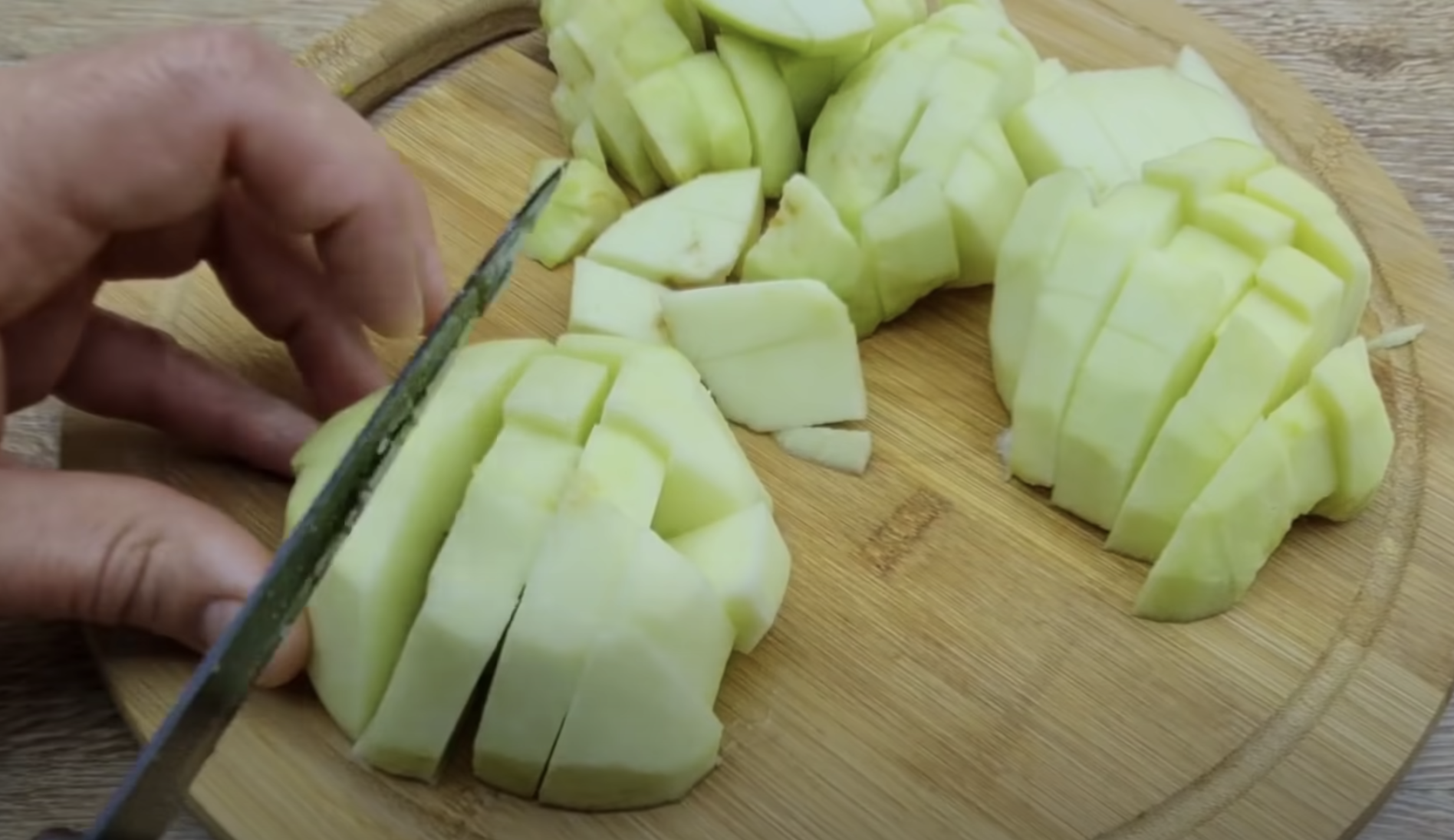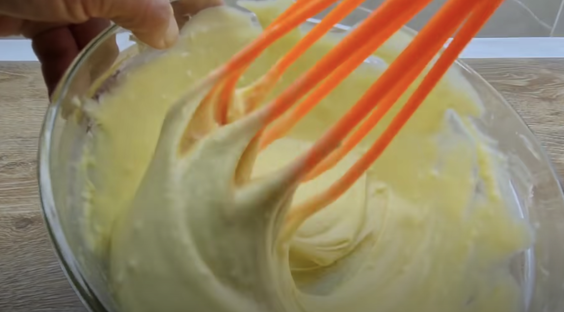 Dodaj roztopione masło, wymieszaj. Wsyp mąkę, proszek do pieczenia, wymieszaj do uzyskania gładkiej masy.