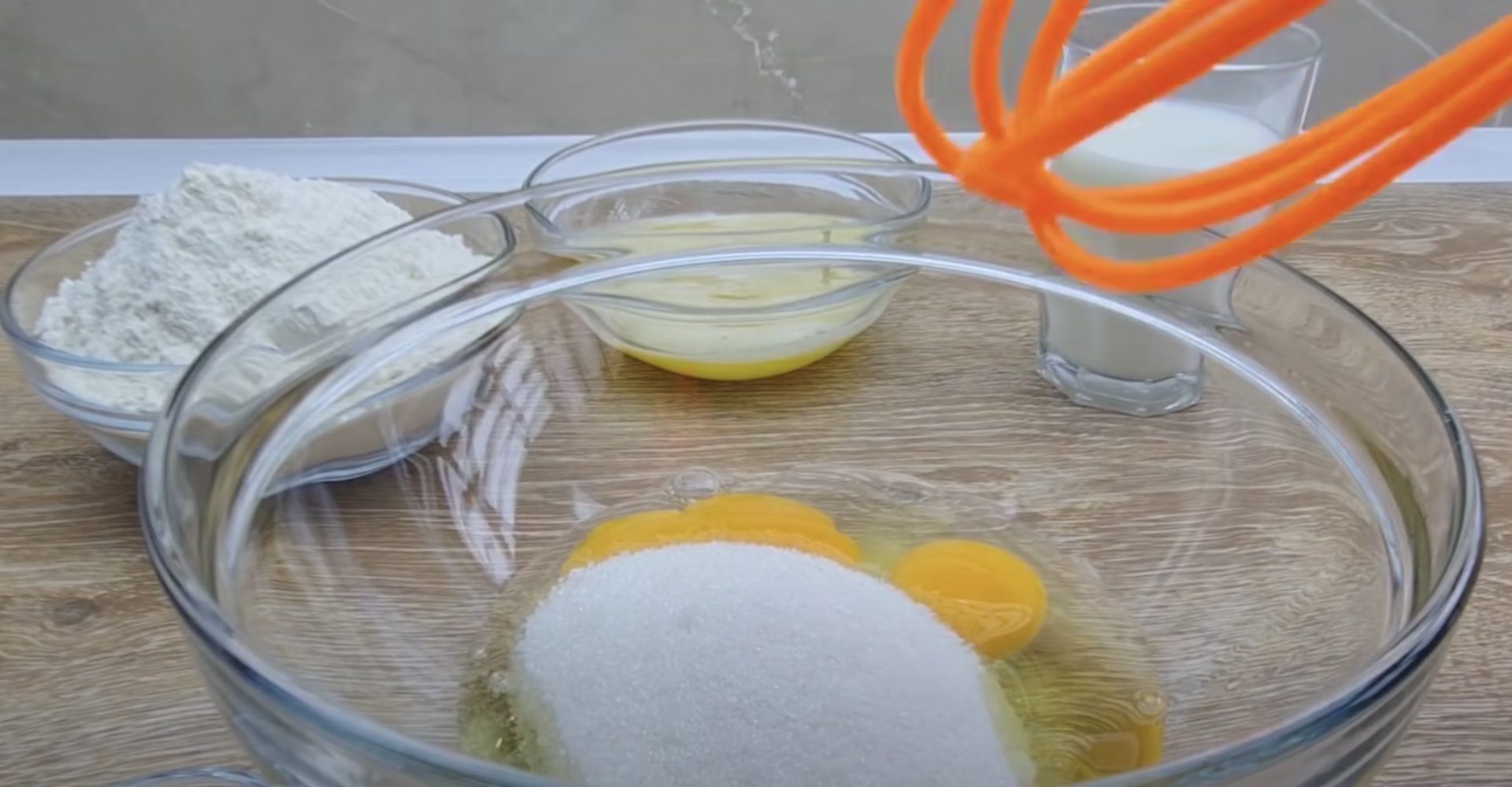 Jajka wymieszaj z cukrem, wlej mleko, wymieszaj.