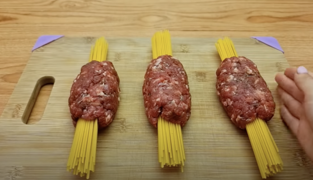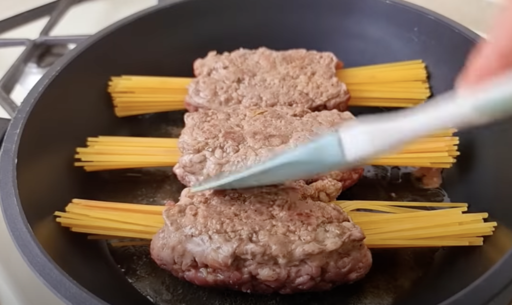 Na każdym kawałku ułożyć mięso tak, aby makaron pozostał na środku, a mięso tworzyło granicę.