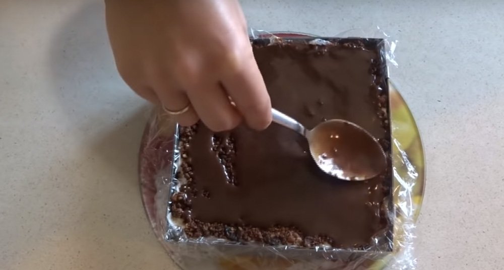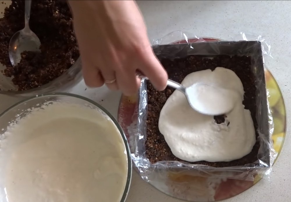 Kolejnym etapem staje się złożenie naszego ciasta. W tym celu należy najpierw przygotować foremkę. Konieczne staje się wyłożenie jej folią spożywczą. Najpierw należy wyłożyć na folię spożywczą herbatnikowy spód. Potem wykładamy na spód masę twarogowo-śmietanową z dodatkiem bakalii.