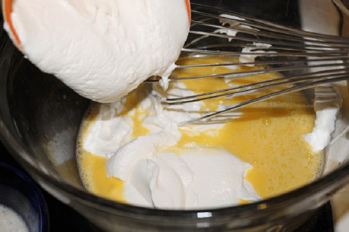 Do masy jajecznej dodaj sodę, twarożek, śmietanę, roztopione masło, szczyptę soli.
