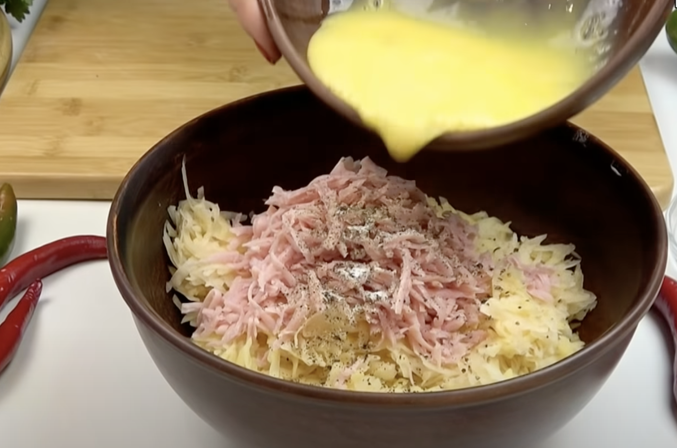 Do tych składników ścieramy ser, dodajemy wędlinę pokrojoną w cienkie paski oraz drobno posiekaną natkę pietruszki.