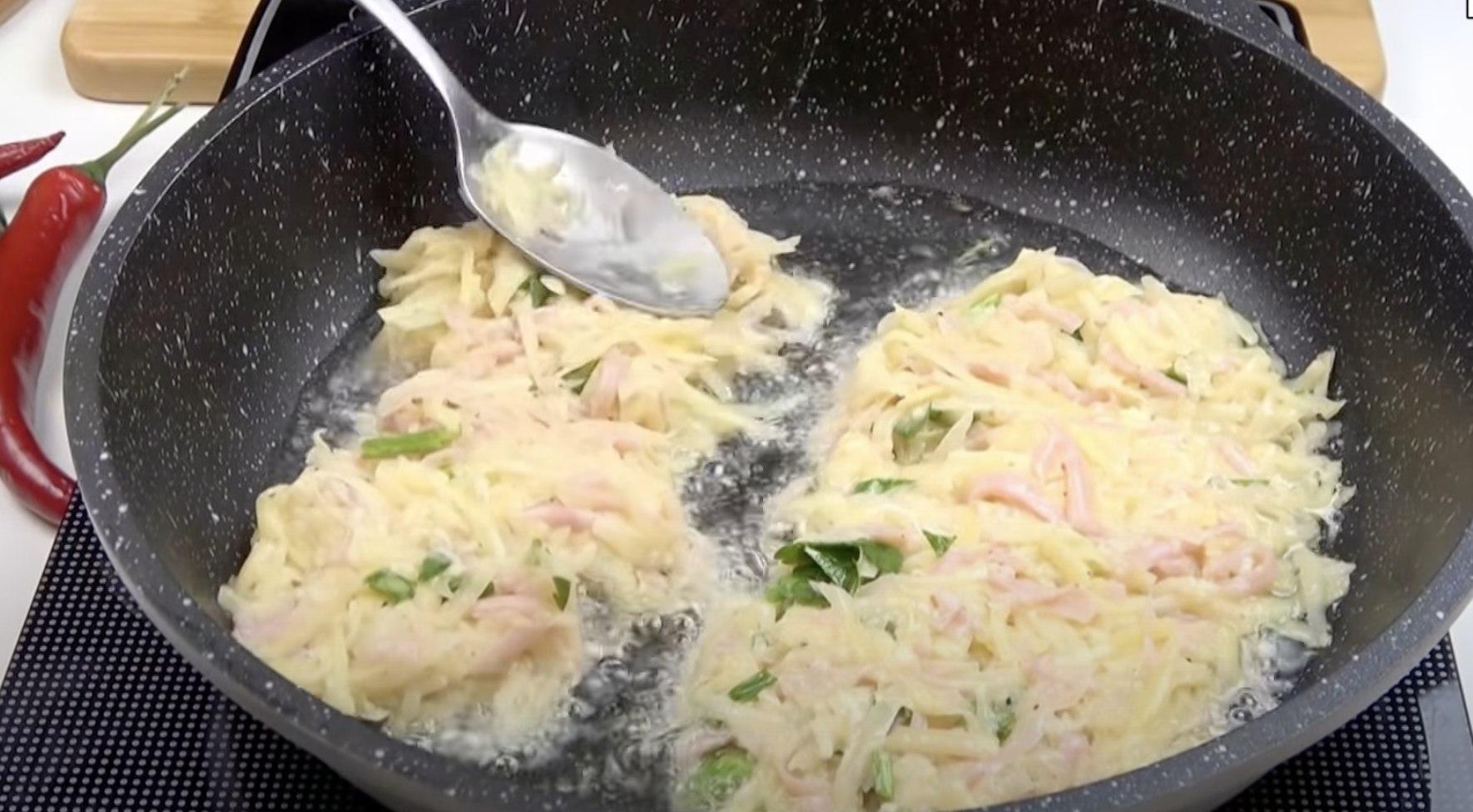 Na patelni z rozgrzanym olejem układamy masę formując placuszki wielkości racuchów. Smażymy aż uzyskają złoty kolor.