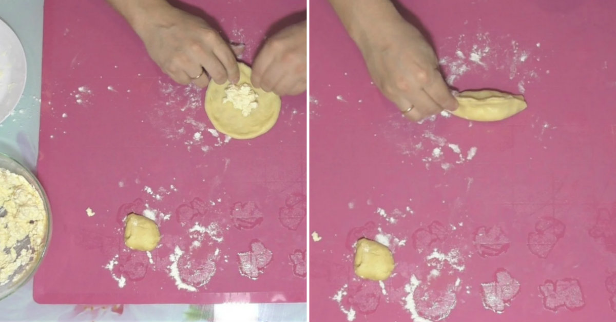Kawałek ciasta obsypujemy delikatnie mąką. Potem ostrożnie rozgniatamy ciasto, aby powstał mały, płaski kawałek. Na środek nakładamy nadzienie twarogowe (należy pamiętać, aby nie przesadzić z ilością) i porządnie łączymy wszystkie rogi ciasta.