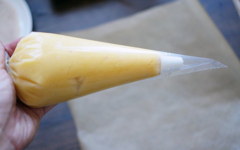 Przełóż ciasto do worka do pieczenia. Rozgrzej olej. Użyj nożyczek, aby pociąć ciasto. Z ciasta powinny powstać „małe kiełbaski”. Podczas smażenia uważaj, aby ciasto nie stykało się ze sobą.
