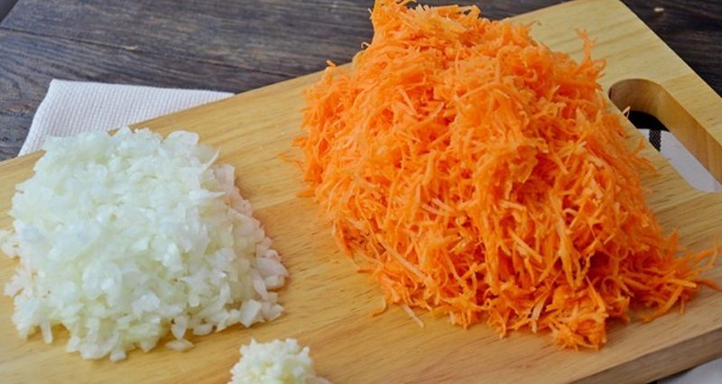 Wszystkie warzywa obierz i umyj korzystając z bieżącej wody, aby mieć pewność, że są całkowicie czyste. Marchew zetrzyj na tace z grubymi oczkami, a cebulę pokrój w niewielkie kosteczki.