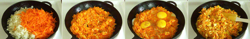 Jeśli marchewki są już miękkie, to nadszedł czas na wbicie surowych jajek do smażonej mieszanki. Następnie dodaj pierz i sól i kontynuuj smażenie na wolnym ogniu przez 5 minut. Stale mieszaj.