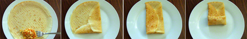 Stworzony farsz przełóż do miski do ostygnięcia. Twardy ser zetrzyj i dodaj do schłodzonej mieszanki. Naleśniki przygotuj według znanego Ci przepisu. Farsz połóż na krawędzi naleśnika (około 1-2 łyżki), a następnie zawiń całość w kopertę.