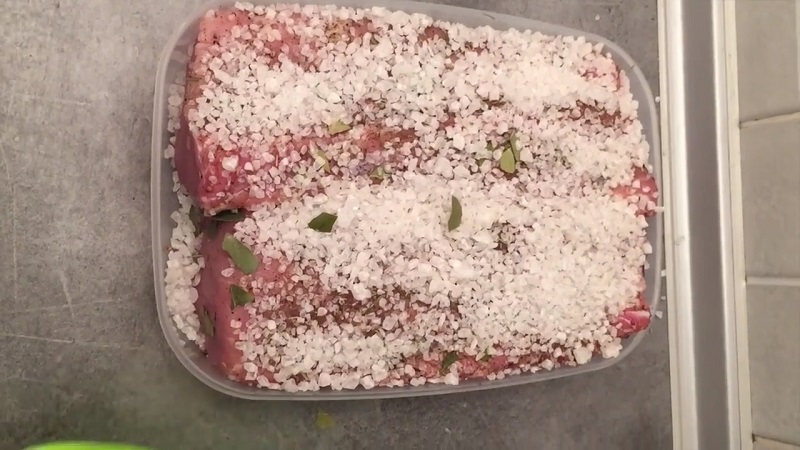 Tak przygotowane mięso włożyć do pojemnika i posolić ze wszystkich stron. Odstawić na dwa dni do lodówki. Należy pamiętać, aby co jakiś czas obracać mięso.