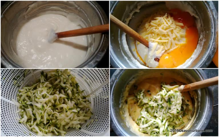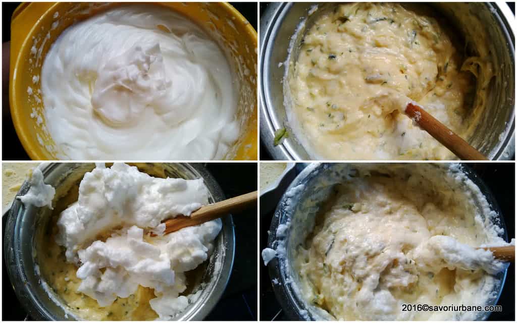 Rozgrzej piekarnik do 200°C. Do sosu dodaj 4 żółtka i 60 g startego sera. Wmieszaj cukinię do sosu i ściśnij ją rękami. Dodaj sól i pieprz do smaku. Białka połączyć ze szczyptą soli i ubić na sztywno.